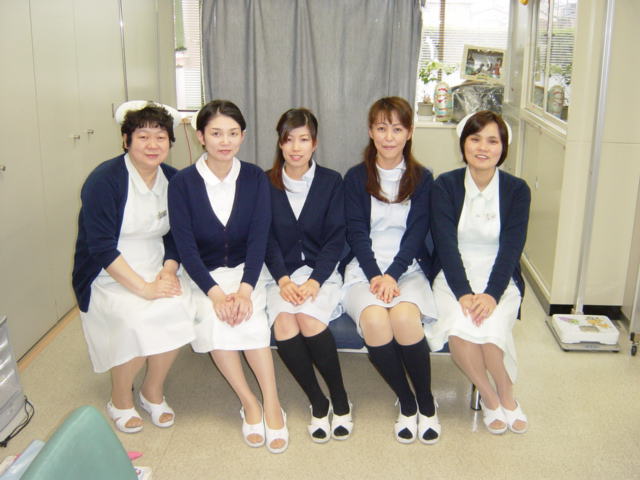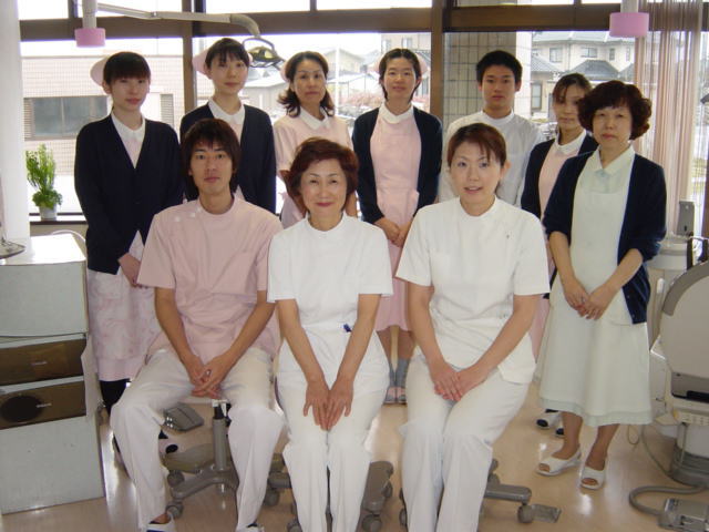 歯科、小児歯科のスタッフ(衛生士、衛生士助手、技工士、事務員)、中心に副院長、両隣が歯科医師。